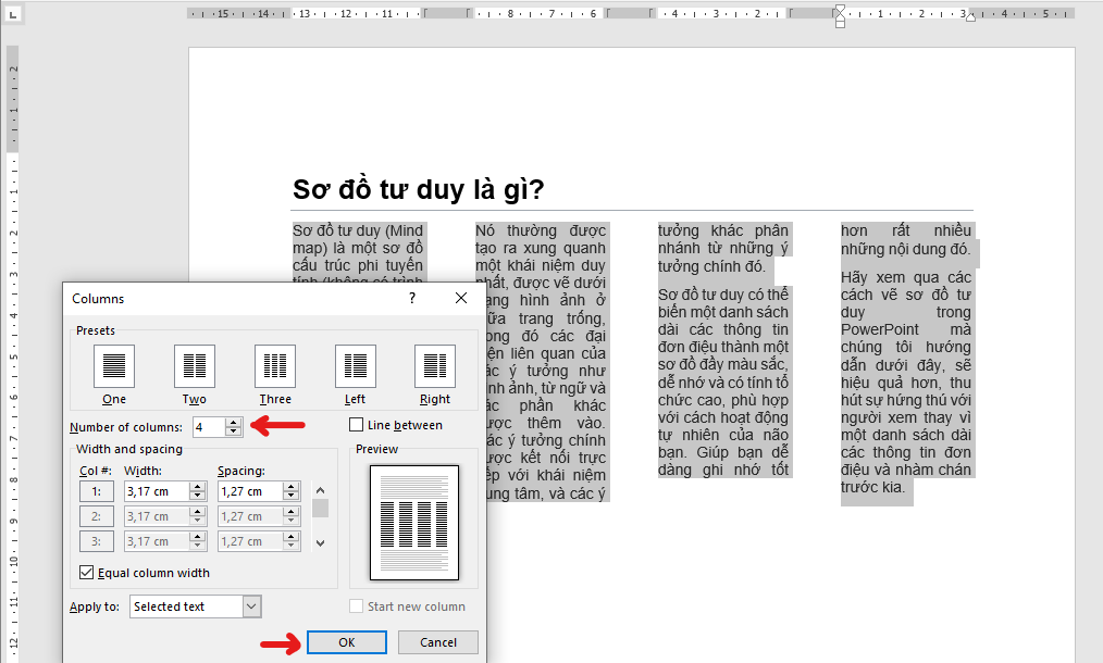 - Nếu muốn số cột được chia nhiều hơn nữa, hãy chọn More Columns… và thay đổi con số tại dòng Number of columns: thành số lượng cột bạn muốn tạo. Sau khi hoàn tất các thao tác, nhấn OK để áp dụng.