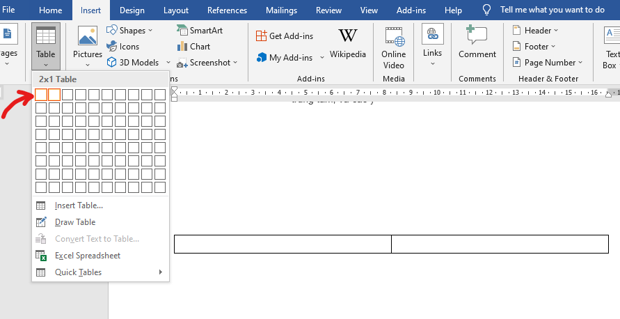 Bước 2: Mở tab Insert, nhấp chọn nút Table và chọn tạo bảng dữ liệu có kích thước 2 x 1 (di chuột qua các ô vuông và nhấn chuột chọn khi định vị được bảng tính sẽ thành 1 hàng và 2 cột).