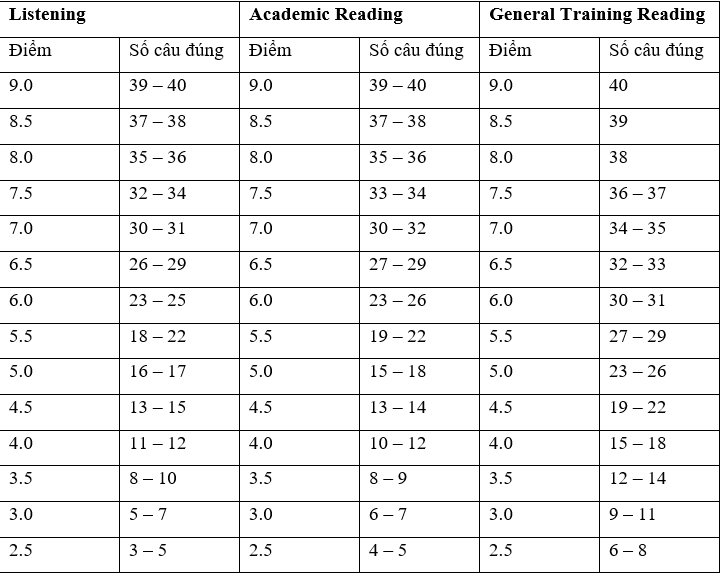Bài thi Listening và Reading bao gồm 40 câu, số câu đúng sẽ được quy đổi tương ứng sang thang điểm 1.0 - 9.0. Bảng dưới đây thể hiện quy đổi điểm đối với kỹ năng Listening và Reading, trong đó kỹ năng Reading có sự khác nhau giữa bài thi Academic và General Training. Bài thi Academic Reading có thể gồm những từ vựng cũng như cấu trúc phức tạp hơn so với bài thi General Training Reading. Chính vì lẽ đó mà cùng một mức điểm, nhưng bài thi General Training Reading có yêu cầu về số câu đúng cao hơn.
