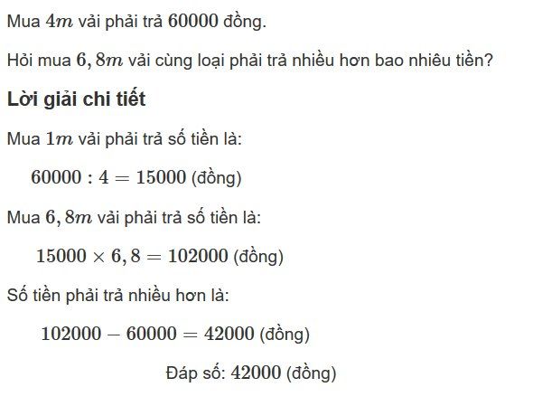 Giải bài 4 trang 62 SGK Toán 5Đề bài:Mua 4m vải phải trả 60000 đồng. Hỏi mua 6,8m vải cùng loại phải trả nhiều hơn bao nhiêu tiền?