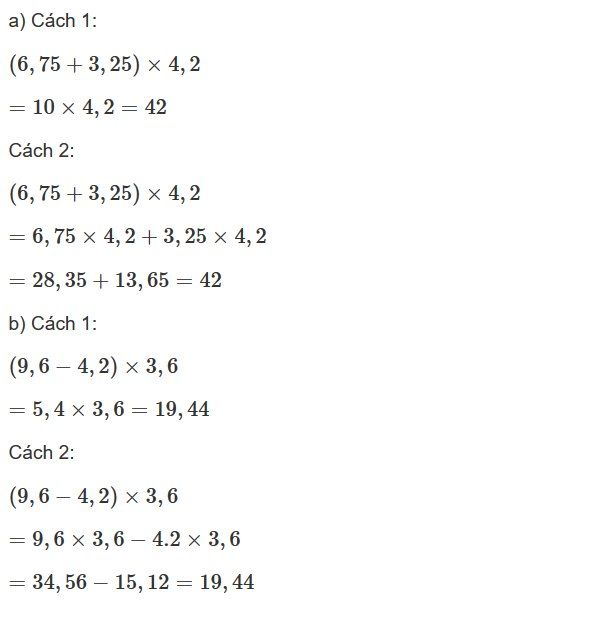 Đáp án:a) Cách 1: (6,75 + 3,25) x 4,2 = 10 x 4,2 = 42 Cách 2: (6,75 + 3,25) x 4,2 = 6,75 x 4,2 + 3,25 x 4,2 = 28,35 + 13,65 = 42. b) Cách 1: (9,6 − 4,2) x 3,6 = 5,4 x 3,6 = 19,44. Cách 2: (9,6 −4,2) x 3,6 = 9,6 x 3,6 − 4,2 x 3,6 = 34,56 − 15,12 = 19,44.