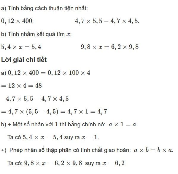 Đáp án:a)0,12 x 400 = 0,12 x 100 x 4 = 12 x 4 = 484,7 x 5,5 − 4,7 x 4,5 = 4,7 x (5,5 − 4,5) = 4,7 x 1 = 4,7b) - X = 1 (từ 5,4 x x = 5,4)- X = 6,2 (từ 9,8 x x = 6,2 x 9,8).